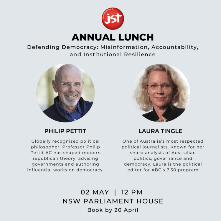 The 2025 Annual Fundraiser Lunch focused on the state of democracy. Professor Philip Pettit AC and Laura Tingle discussed what is going on in the US and Australia. Prof. Pettit shared notes.